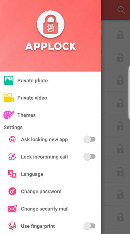 - 支持多种类型的应用程序锁:密码锁,模式和指纹锁