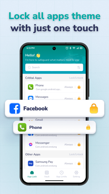 您的个人数据极其重要。让应用锁使用密码、指纹、面部识别码、PIN、密码或图案保护您的手机。