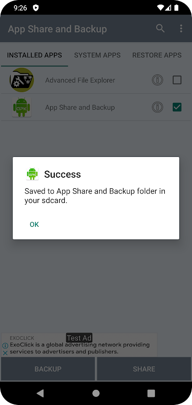 App Share and Backup 允许用户提取 apk,备份选定或所有应用程序,并允许用户共享应用程序。它还允许从指定文件夹恢复(安装)apk 文件。