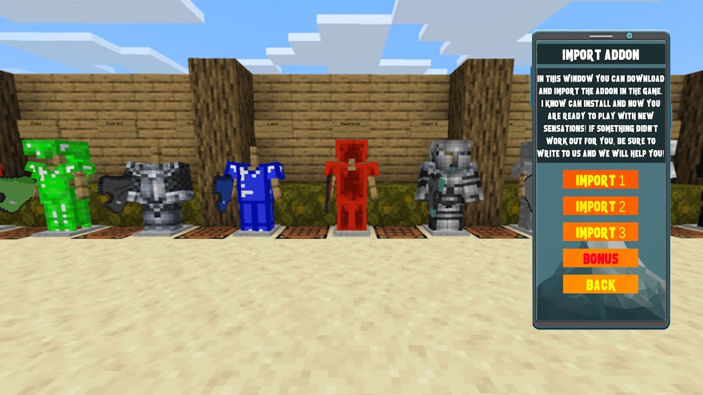Thanks to this Armor Mod, you no longer have to use boring standard tools for setting functions and characters from the standard MCPE, and a modern and interesting Armor Mod for Minecraft PE with many additions will come to your aid