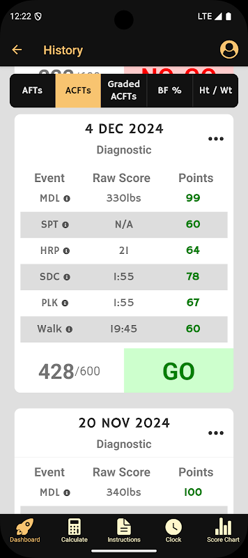 精确计算您的 AFT、APFT 或 ACFT 分数——包括对永久档案和备选有氧项目的全面支持。将分数保存为“练习”或“记录”以便整理,并通过包含交互式图表的详细仪表板跟踪您的长期进步,该仪表板支持纵向和横向显示。