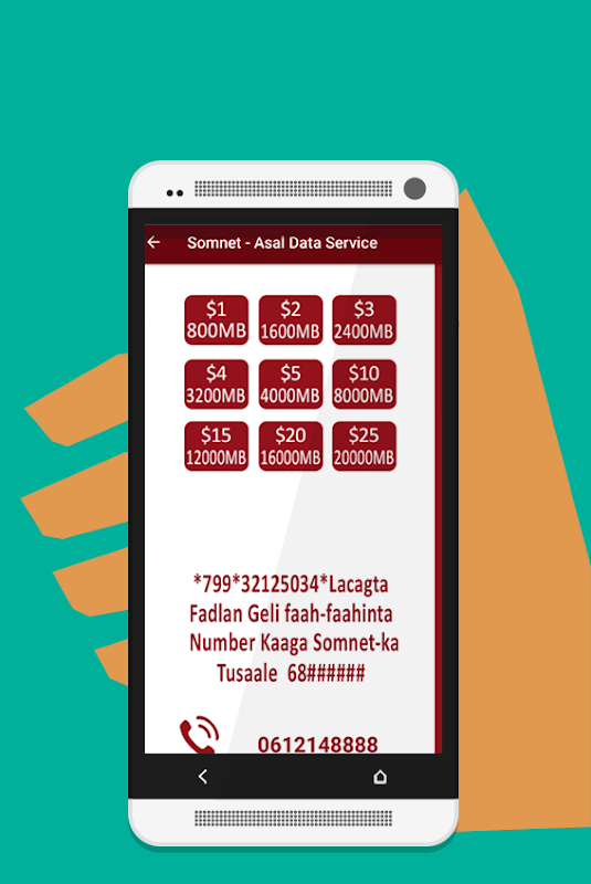 Waxaad ka iibsan kartaan xirmooyinka SomNet. Hada kadib uma baahnid in aad cid la hadashid ama qarash telefan ku bixisid si laguugu shubo xirmo SomNet hadii aad isticmaashaan Asal Data Service app. Sidoo kale ka waxaad ka heli doontaa Adeegyada EVC Plus, ANFAC iyo Artimet