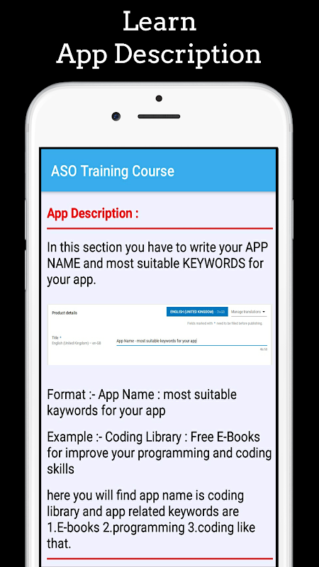 此应用商店优化培训课程在在线上传的每个级别中,讨论了实现出色的应用搜索引擎优化的长期而深入的过程:关键词研究,撰写标题,简短描述和冗长内容,选择最佳图标等。