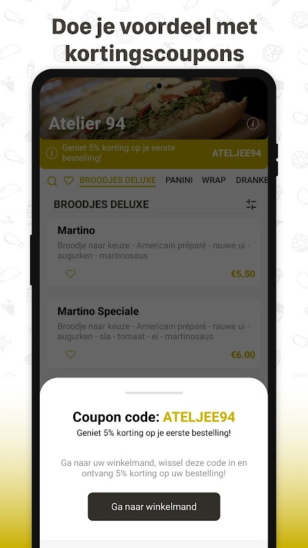美味的三明治、您的涂抹酱或肉类,无需排长队?下载 Ateljee 94 应用程序并在线订购。