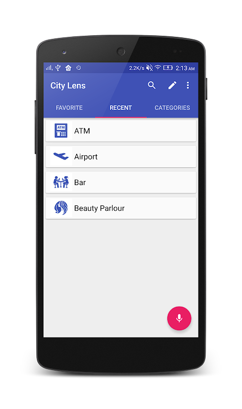 City Lens is designed for helping people when travelling to different city. It searches places near to user's current location based on selected category.For every listing you can choose to see its location on a Map, view the route from where you are.