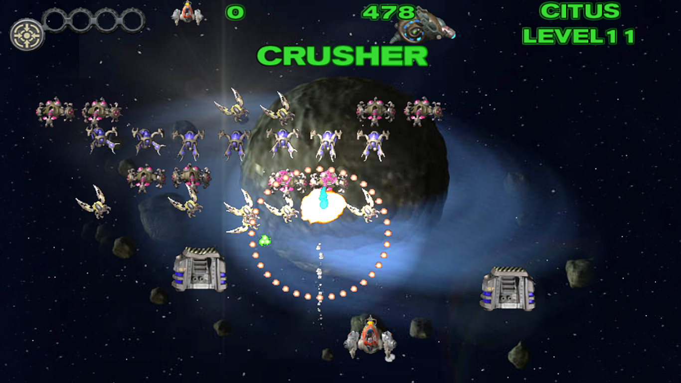 Make you way through enemy attack waves in your task of liberating planet systems from alien cyborgs invasion. Feel an unconquerable power of your weaponry while destroying cyborgs and obtainingextra-weapons. Feel the pride when a mighty command ship falls to pieces under your fire finding the only vulnerable place. You're gonna atomize or you're gonna be atomized!
