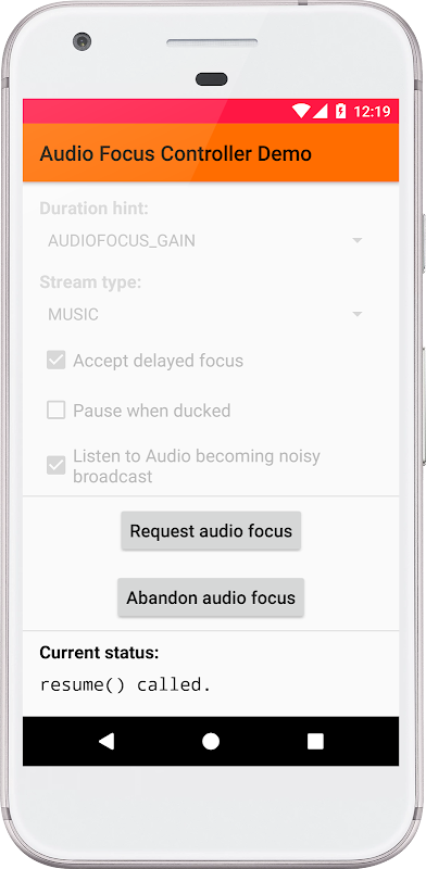 AudioFocusController是一个Android库,可帮助您以最少的代码管理应用程序中的Audio Focus。该应用程序不仅演示如何使用库,而且还有助于测试如果失去音频焦点,您的应用程序是否可以正常运行。