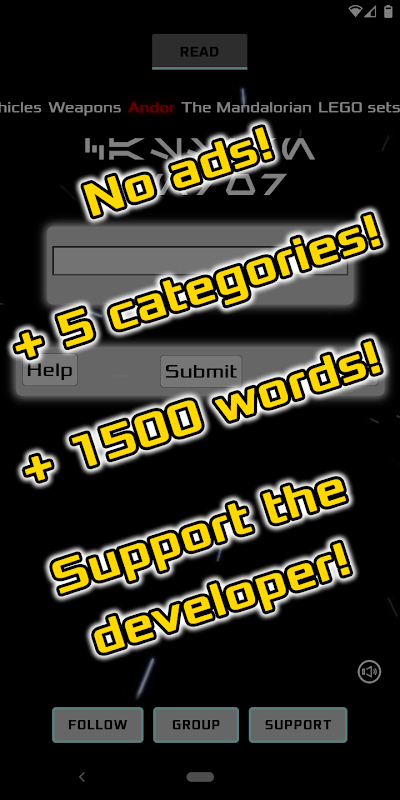 Aurebesh.org 自 2016 年以来一直存在,是学习 SW 语言的头号工具(该网站还设有 Mando'a 培训师)。该网站会定期更新新功能和改进,这些都会反映在应用程序中。这包括,例如,更新的类别和单词列表。