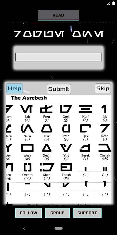 使用 Aurebesh.org 的 Aurebesh Trainer,您将立即掌握 SW 字母表。具有读写部分(读:翻译用 Aurebesh 写的单词,写:将普通单词翻译成 Aurebesh)。除了对练习 SW 字母表非常有用之外,您还可以将其用作翻译器来破译一段 Aurebesh 文本。