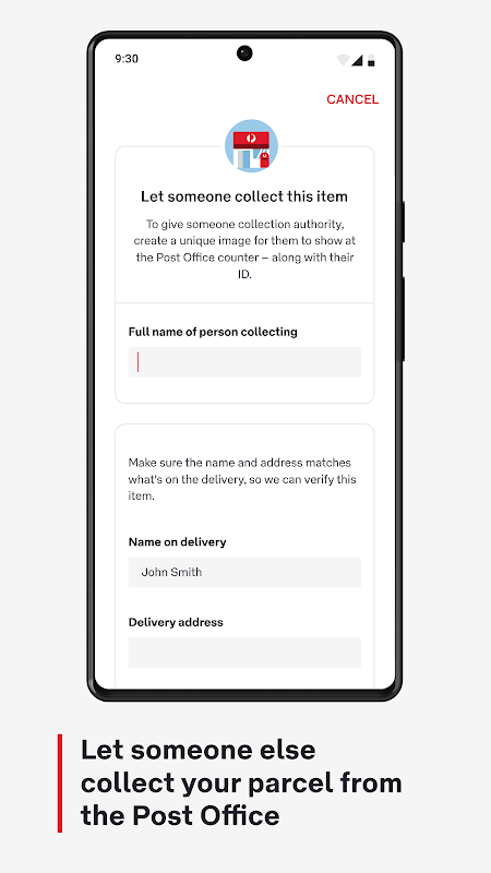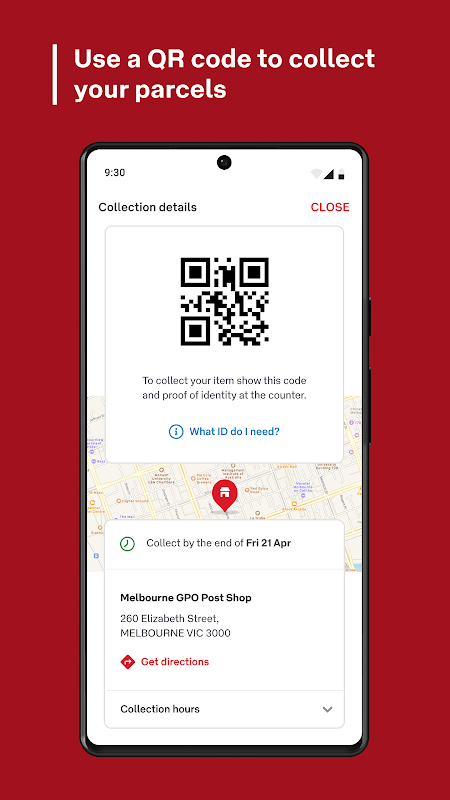 • 取件二维码 – 使用应用程序的取件二维码从邮局取件(而不是实体卡)。