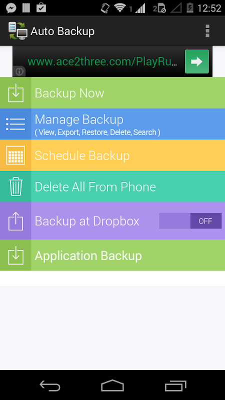 This application is an enormously powerful app with very user friendly interface, designed by DRC Infotech. It enables you to take SMS(sent/inbox),Call Log and Contacts backup at scheduled time.