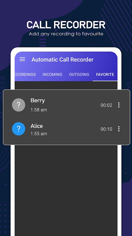 通过提供不同的通话录音功能,该应用程序更加可靠和组织良好。通话记录器允许您选择记录每个来电和去电的选项,或从联系人中选择要记录和不想记录的呼叫。