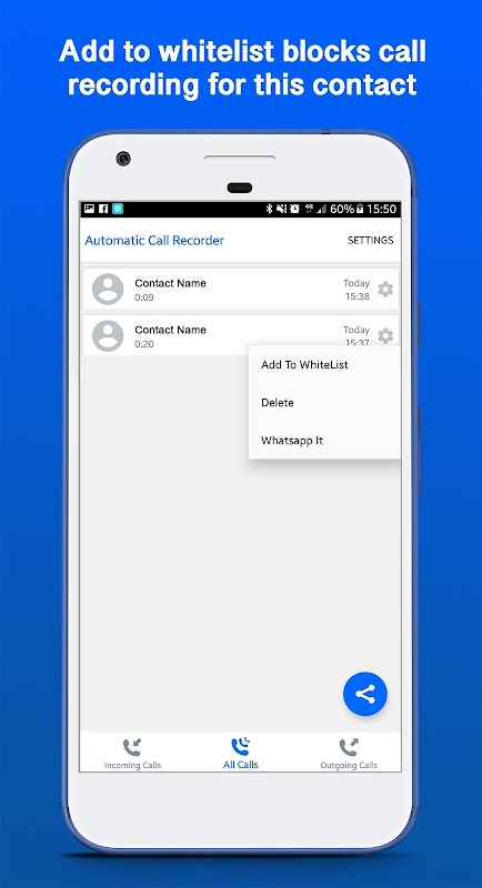 With Automatic Call Recorder you can record all your incoming and outgoing calls in HD quality. Automatic Call Recorder is free and ad-free.
