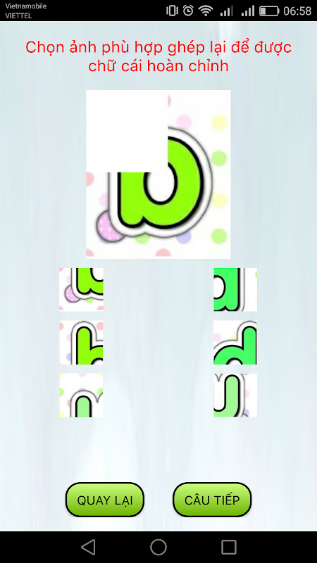 - Chọn ảnh ghép đúng: Bé chọn 1 trong 4 mảnh ghép còn thiếu của chữ cái, chữ số