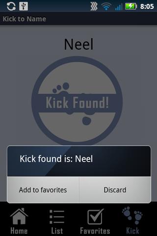 Open the app to the "Kick" page, choose whether you want a girl name or boy name. Then, place phone face down on mommy’s tummy while baby is active. When a kick is found, the app will sound a chime and display your baby's name choice from a list of thousands. You will have the option to "Add to Favorites" or "Discard" the name given by the baby name generator.