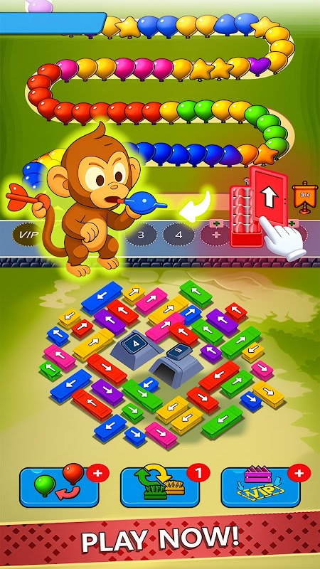 你的主要任务?在生存的前提下,尽可能多地戳破气球。戳破的气球越多,获得的积分就越多——你就越接近解锁新的猴子、特殊香蕉类型、强化道具和疯狂服装。