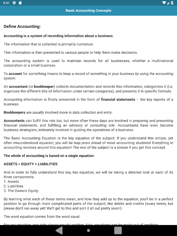 这个应用程序会为您介绍一些基本的会计原则,会计的概念,和会计术语。一旦你熟悉这些术语和概念,你就会明白会计轻松。一些你将学习包括收入,支出,资产,负债,损益表,资产负债表和现金流量表的基本的会计术语。