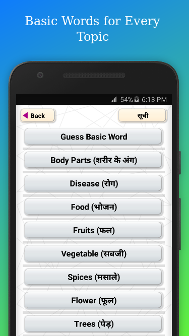 Basic शब्दार्थ Hindi to English is a word meaning application for all students. We arrange more than five thousand basic words in english which can be used in our daily english speaking. There are more than twenty category of basic english words and each category have 300 words. You can use this app as hindi to english dictionary offline. All words can be accessible in offline. English pronunciation is very important in learning english so in addition to english word meaning, there are english pronunciation for all words in this application. If you want to listen english pronunciation please check your device internet connection. So you can say this is also an english dictionary with pronunciation. We this hindi to english word meaning app will help you to improve your english skill.