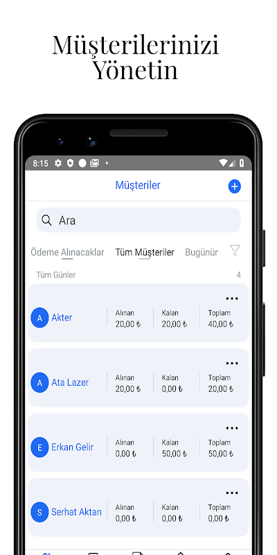 Sadece alacaklı olduğunuz müşterilerinizi tek tuşla görün. Sabit müşterilerinizi hangi gün sipariş almaya gidiyorsanız o günü seçerek ekleyin, “Bugünün Müşterileri” seçeneğine tıkladığınızda hangi gün hangi müşteriye gideceğim diye düşünmeyin.