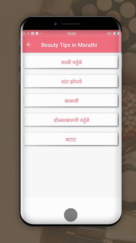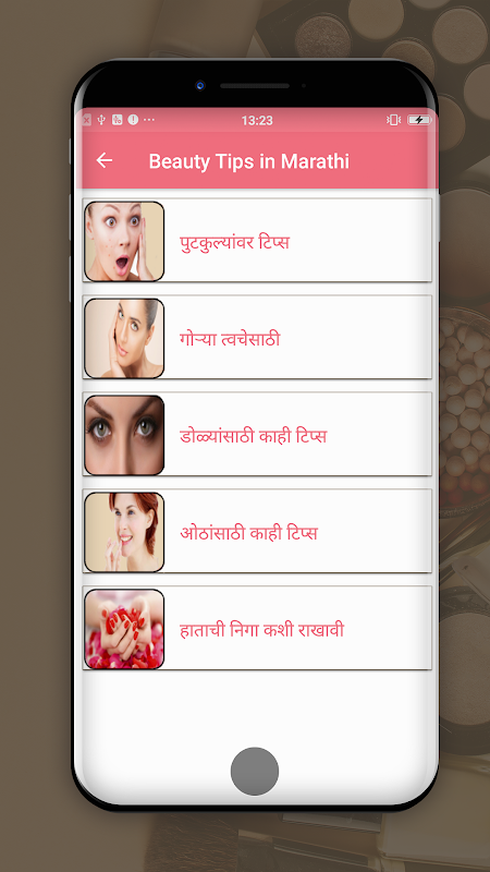 In Application many categories available like 1.balo ke liye tips, 2.Chehre ki dekhbhal, 3.Muhaso par tips, 4.Gori Tavacha pane ke tarike, 5.Hotho ki Dekhbhal, 6.Hatho ki dekhbhal,etc..