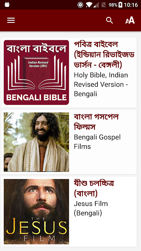 使用孟加拉语圣经应用程序阅读和冥想孟加拉语的神的话语。孟加拉语圣经应用程序支持几乎所有 Android 设备。我们已完全免费提供此应用程序供您下载和使用。并行英语和印地语圣经是孟加拉语圣经应用程序中的另一个突出功能。孟加拉语、英语和印地语圣经经文可以以两个窗格或逐节布局显示。