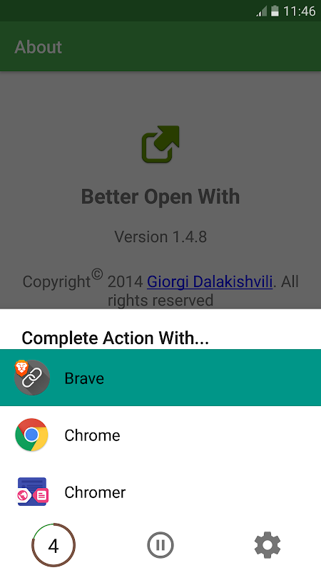 创建“使用完整行动”对话框中,更好的打开方式显示了一个视觉上相似的弹出窗口,以模仿Android的默认,当您选择打开链接,图像,PDF或任何其他文件类型 - 列出所有可能的应用程序的处理程序你通常看到的。