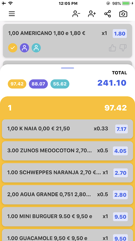 Take a photo of the bill and the app automatically detects all the items on it, all you need to do is to split them.