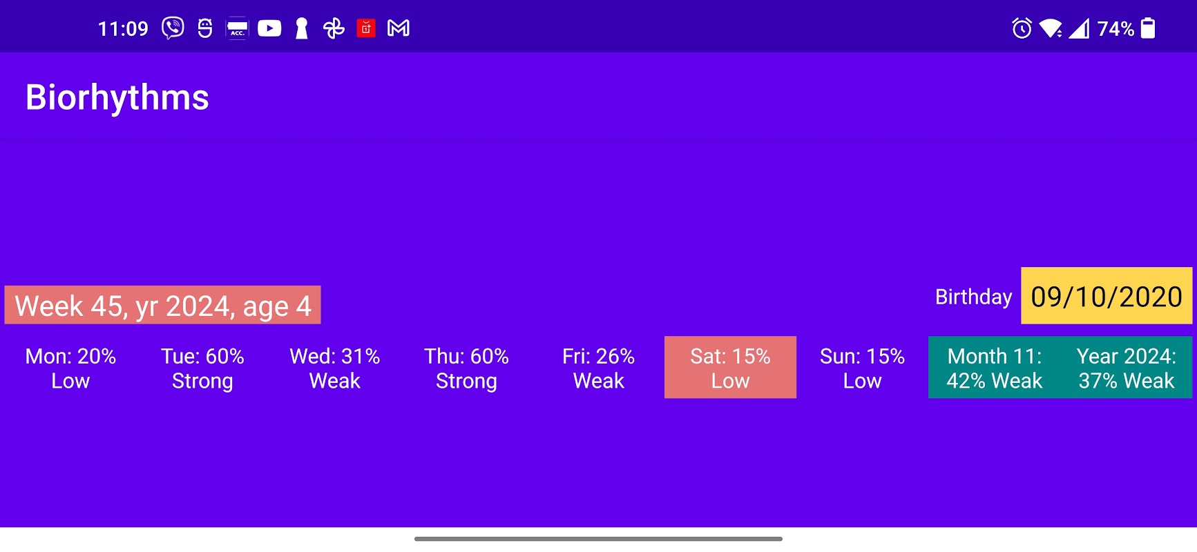 以您的生日为起点计算您的生物节律。这是一种神秘的、不科学的计算。它允许用户查看他的生物电势的节律。您可以定义所显示分数的含义和意义。它们不是对您潜力的限制,而是计划您活动的起点。观察您的反馈并决定:如果这个应用程序对您有帮助,请使用它,否则忽略它。