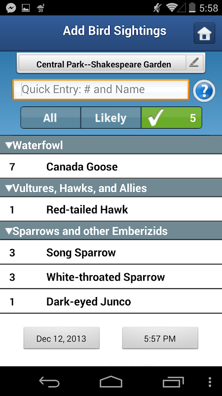 -- Enter birds quickly and easily as you see them using bird codes or full names