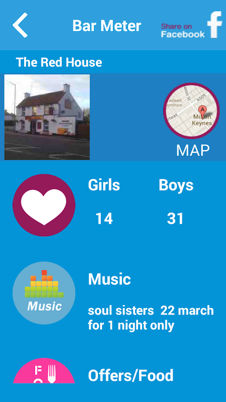 5,Facebook share to let friends know where you are, or to show them how bizzy the night is. And to share deals and discounts.