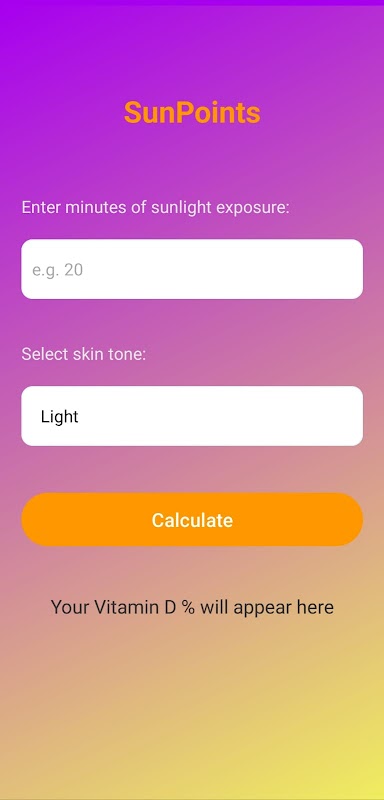 这款简单易用的应用程序可帮助您将每日日照量转换为维生素 D 摄入量百分比,并可根据肤色进行个性化设置,以获得更准确的结果。