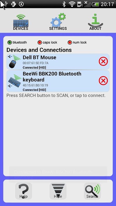 IMPORTANT: Samsung Galaxy phones and some HTC Models do not support Bluetooth L2CAP, needed for Blueinput to open a connection to your bluetooth keyboard or mouse. Please do not under rate Blueinput for something that is beyond our control. We have provided this software for free, investing a lot of our time into making something useful!