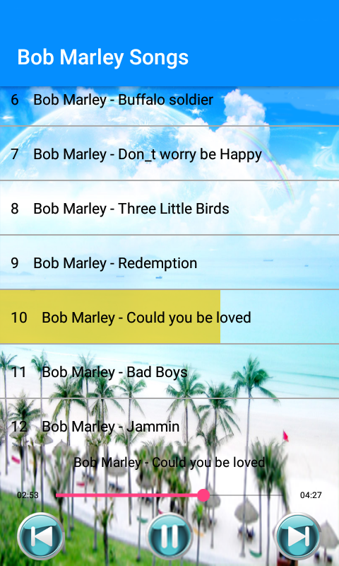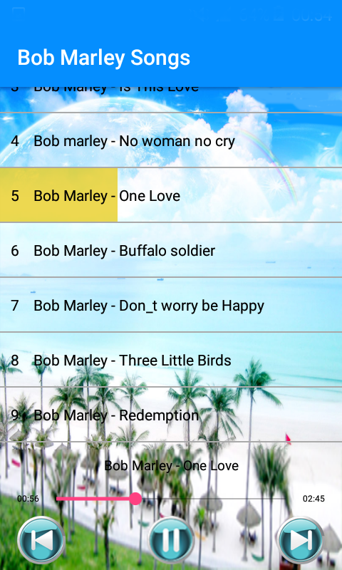 This application provides a collection of popular songs from Bob Marley. Choose and play your favorite songs anywhere and anytime.