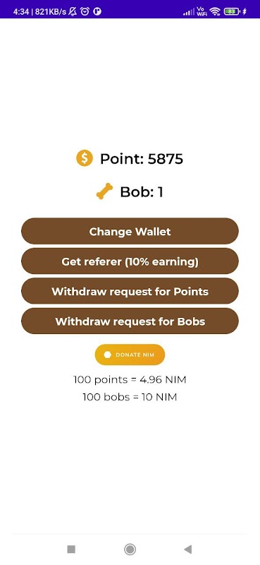 BobiNim 是赚取加密货币的应用程序。您可以观看视频,旋转积分,完成任务以获得鲍勃。在积分/鲍勃之后,您可以请求 NIM (Nimiq)。