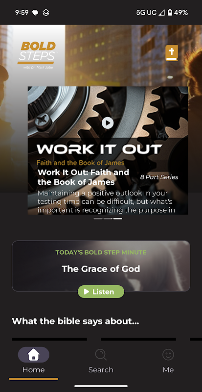 在“大胆的步骤”应用程序中,您会发现乔布博士在芝加哥市中心新生命社区教堂的牧灵事工中以圣经真理为中心的引人注目的信息。在旅途中?您还可以通过“大胆的步骤一分钟”找到一些简短的励志真理,这些新鲜的生活智慧可以带到健身房、杂货店或通勤时携带。对信仰或圣经有疑问吗?搜索对您最重要的主题,从寻找目标到经历考验,为您的生活提供清晰且适用的见解。或者,如果您想观看解决这些棘手主题的视频,您会发现涉及当今相关问题的长视频和短视频。