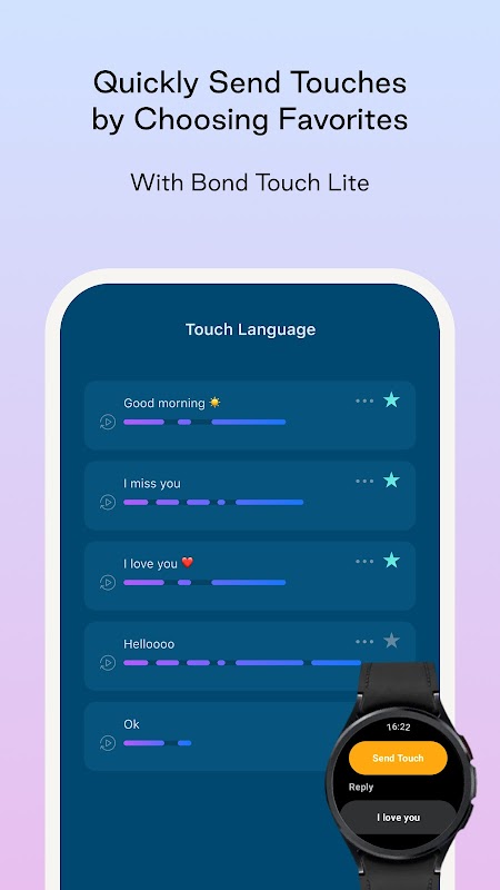 • Bond Touch Lite:Wear OS 手表上的 Bond Touch 轻量版(需要 Bond Touch 手机应用和有效的订阅)。