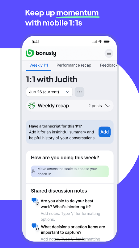 Bonusly 可实时庆祝成就并指导绩效。您可以随时随地进行表彰,录制简短视频使其更具个性化,或在会议间隙进行签到。从同事间的互相表扬到绩效总结,Bonusly 帮助您保持参与度、步调一致,并随时准备以最佳状态完成工作,一切尽在您的移动设备上。