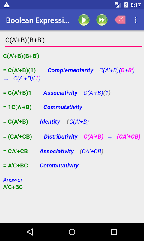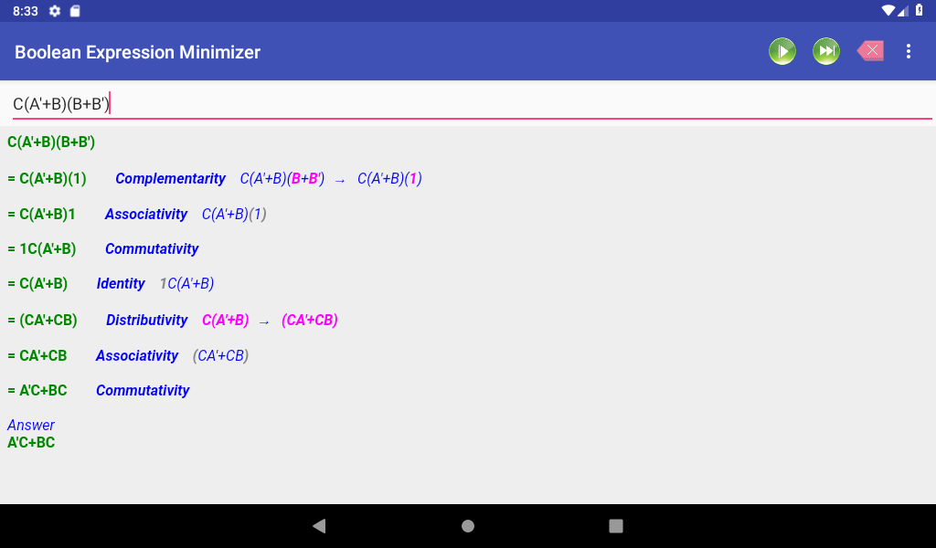 布尔表达式最小化器提供布尔代数表达式的逐步简化。有两种模式可用: