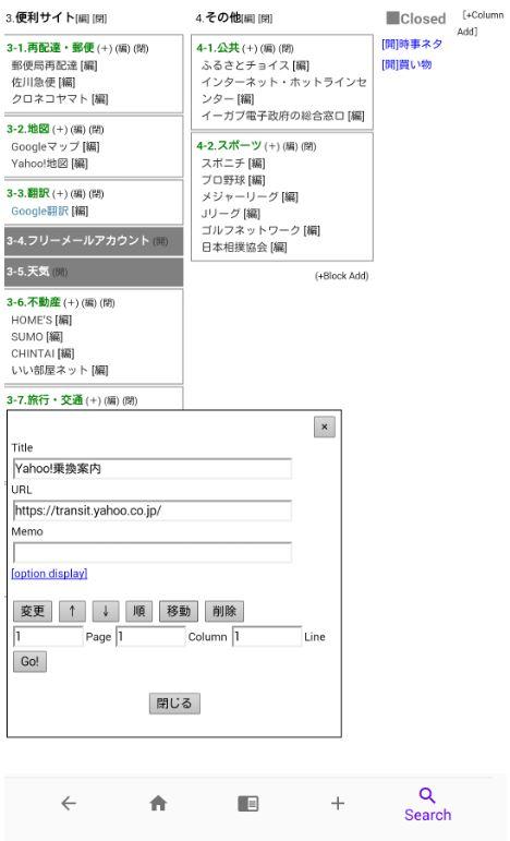 (Addボタン).....追加ボタン、現在表示しているURLをBooMLinkにワンクリックでブックマークとして追加します。(保存先:「追加ページ」列の「iPhoneアプリより」行にリンクが追加されていきます)検索ボタンで追加したいホームページを表示させ、この追加ボタンを押していくやり方がおすすめです。追加後のカテゴリ移動・並び替え・編集も楽なので、どんどん追加して仕分けしていきましょう!