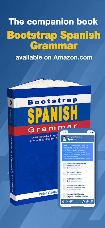 现在有一本名为“Bootstrap Spanish Grammar”的配套书籍。本书包含本书包含的所有内容——包括 209 个语法主题和 3,700 多个示例短语。