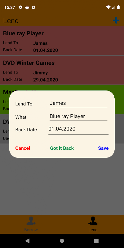 是否曾经借过东西并借出东西而忘了退还?有了这个程序,您将永远不会忘记取回您借出的东西或归还借来的东西。它也提醒您何时该要付出或收回。