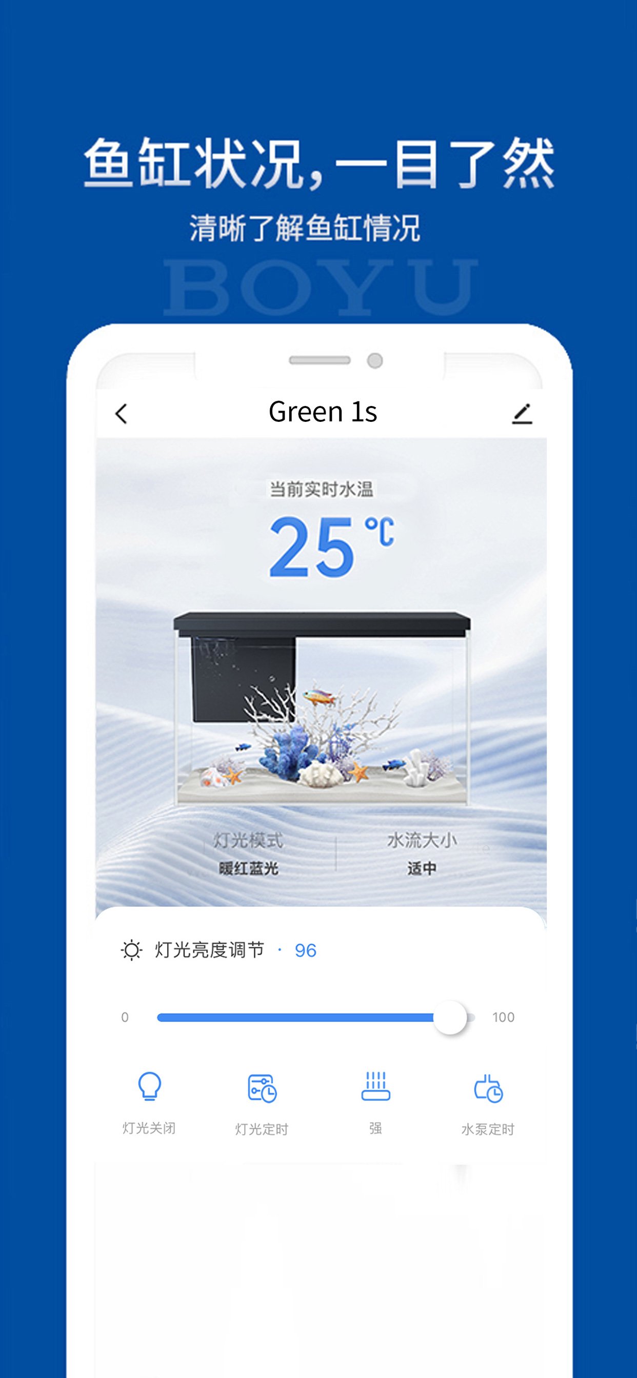 1.通过WIFI连接智能云,实现智能远程控制博宇的智能设备(包括水泵、水族箱、灯具、智能宠物用品等)。只要设备接入网络,你都可以远程通过手机实时操控和检测设备运行的状态