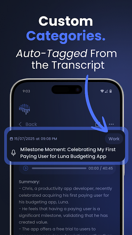 - 智能摘要和标签:立即获取要点并跳转到重要内容。分类功能使语音笔记井然有序,方便快速检索。