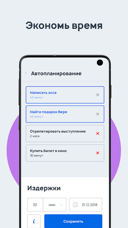 Автопланирование – это полезная и оригинальная функция, позволяющая распределить задачи на день согласно своему личному расписанию и издержкам, которые нужны каждому человеку для отдыха и личной жизни. Больше не нужно беспокоиться о том, сможете ли вы всё успеть, ведь у вас есть ваш новый органайзер, который не даст вам пропустить текущий список дел. Приложение всё упорядочит и подскажет, как оптимальнее следует поступить сегодня.