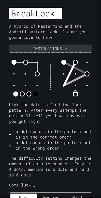 游戏提供三种难度设置:简单(4 个点)、中等(5 个点)和困难(6 个点)。随着关卡的推进,图案会变得越来越复杂,破解难度也会随之增加。