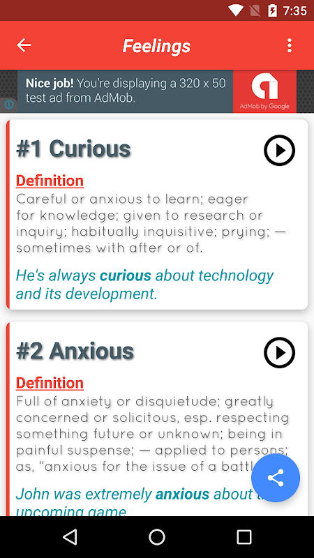 Our vocabulary lessons teaches you new words from many categories. Definitions and examples are written together with the word and an audio is provided so you can listen to the pronunciation.