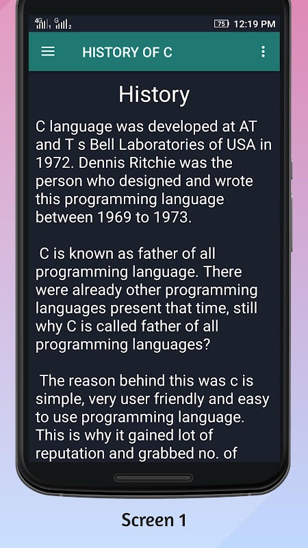 C Language Tutorial is a free app where you can learn c language from your android device.By this app you can learn each and every topic in details.C Language Tutorial contain history of c and every topic with simple and understandable example.