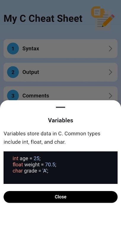 • C 备忘单:快速访问基本的 C 语言语法和函数,以便于参考。