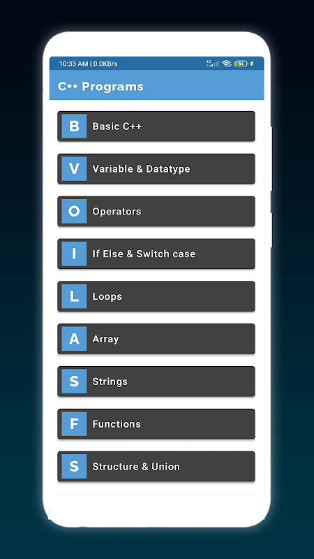 C++ Programs : 500 + C++ Examples 有一个非常简单的用户界面。您会发现它是 Play 商店中最好的应用程序。只需安装应用程序,打开,所有基础章节就会呈现在您面前。点击每一章可以看到里面的内容。