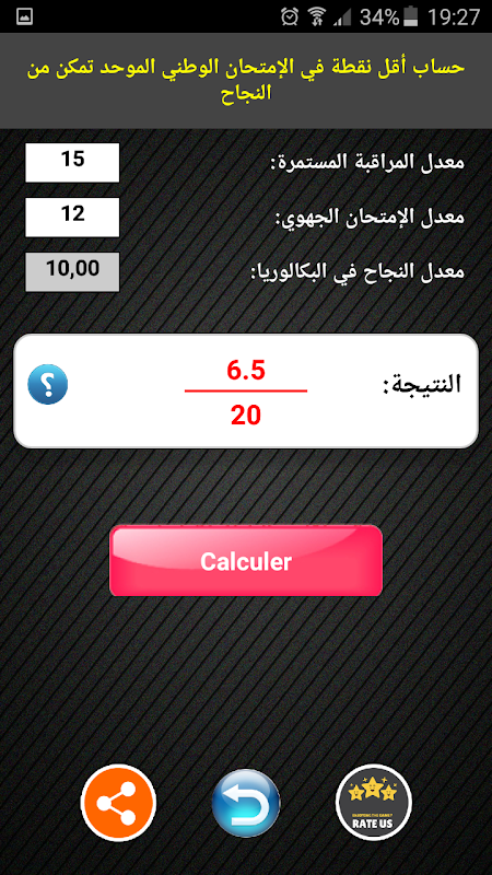 3- Calcul de la note nécessaire dans l'examen national pour obtenir la baccalauréat avec une note donnée: vous allez avoir besoin de la moyenne obtenu dans l'examen régional, la moyenne des contrôles continues, et la moyenne désirée dans la baccalauréat.